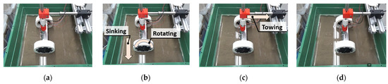 Experimental procedure for measuring the resistance force. (a) Initial state; (b) rotating state; (c) sinking state; (d) towing state.