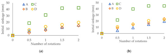 The relationship between the number of rotations and initial sinkage. The vertical axis represents the initial sinkage, and the horizontal axis represents the number of wheel spins. The legend shows the wheel shape. (a) Non-water-containing sand and (b) water-containing sand.