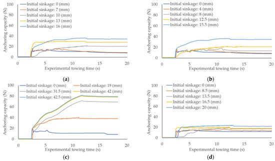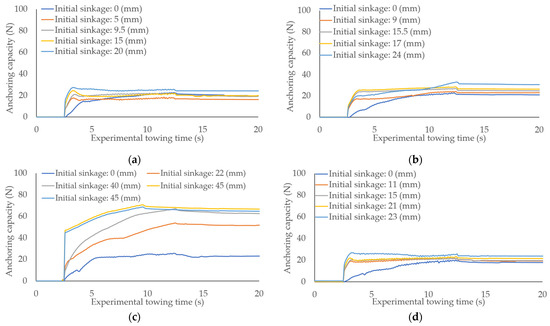 The relationship between the initial sinkage, experimental towing time, and anchoring capacity on water-containing sand. The horizontal axis represents the experimental towing time. The vertical axis represents the anchoring capacity. The legend shows the initial sinkage. (a) Wheel A; (b) Wheel B; (c) Wheel C; (d) Wheel D.