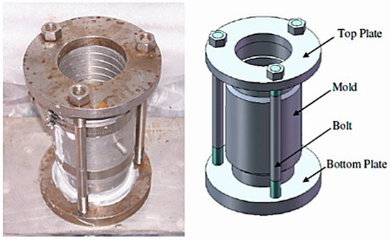 A typical split mold was modified to prepare a simulated hydraulic fill specimen, as shown in Figure 4. This mold was constructed from a typical two-part split mold, top and bottom steel plates, and three steel rods and nuts. The top and bottom plates were designed to seal against the top and bottom of the mold. The top and bottom plates were connected securely using three threaded steel rods tightened by nuts. A rubber gasket was used to seal the mold at the bottom. Silicone was applied to help seal the gap between the two pieces of the split mold, as well as the top and bottom plates. This system was completely sealed while preparing the hydraulic fill specimen.