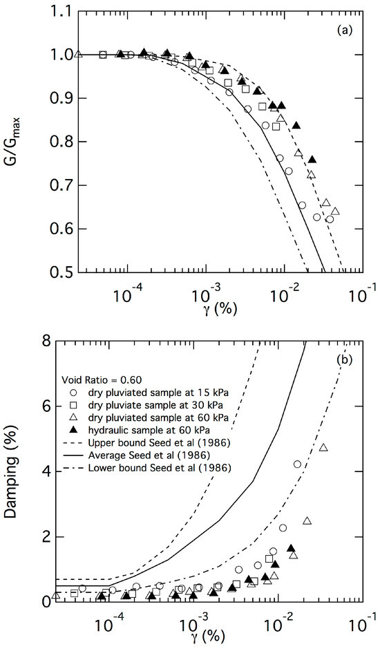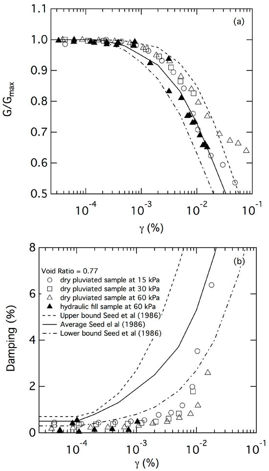 - Seed, H.B.; Wong, R.T.; Idriss, I.M.; Tokimatsu, K. Moduli and Damping Factors for Dynamic Analysis of Cohesionless Soils. J. Geotech. Eng. ASCE 1986, 112, 1016–1032. [Google Scholar] [CrossRef]