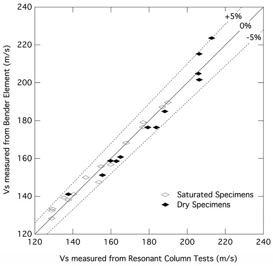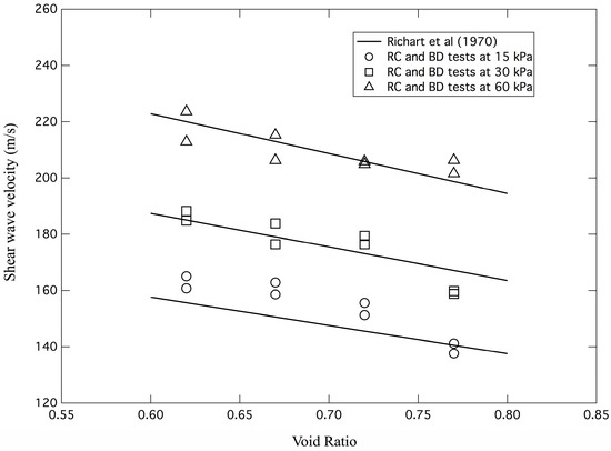 The shear wave velocity measured at a low strain on the dry pluviated Ottawa sand and the simulated hydraulic fill Ottawa sand at the confining pressures of 15, 30, and 60 kPa is presented in Table 2. These results were compared with an approximate expression for the low-strain shear wave velocity (Vs) (or low-strain shear modulus, Gmax) of clean rounded sands proposed by [16,29]. For isotropic conditions, Vs (in SI units) is calculated from: