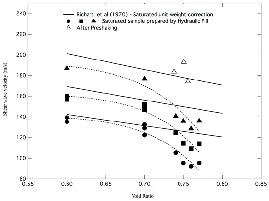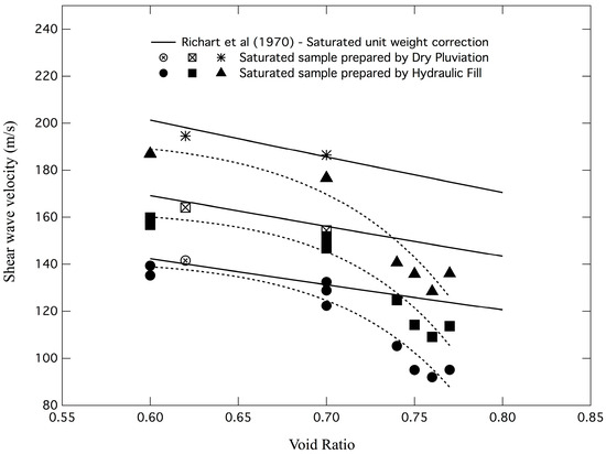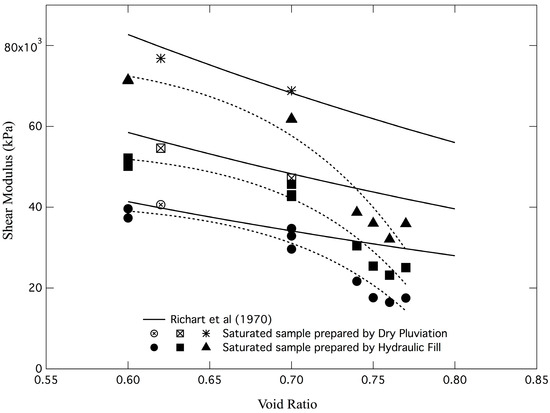 The simulated hydraulic fill specimens were prepared using the frozen sample technique; the effect of freezing and thawing on the specimen may have contributed to the measured values of shear wave velocity. As a result, the frozen sample technique was investigated. Two soil specimens, at void ratios of 0.62 and 0.70, were prepared by dry pluviation, then saturated, frozen, thawed, and tested following the same procedure used for the simulated hydraulic fill specimens. Shear wave velocity measurements were performed on these specimens, and shear modulus was calculated from Equation (2). The values of the shear wave velocity of the saturated sample prepared by the dry pluviation method were compared with those in [16], and the results from the simulated hydraulic fill sample are shown in Figure 10. The values of shear modulus from saturated soil specimens prepared by dry pluviation are compared with the generic shear modulus developed from Equation (3), as presented in Figure 11. The open symbols represented the saturated soil specimen prepared by dry pluviation and show good agreement with the generic shear modulus curves proposed in [16]. These results indicate that the effect of the frozen sample technique is negligible.
