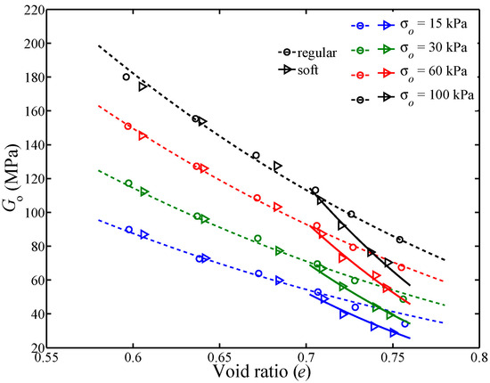 The effect of fabric on low-strain shear modulus of granular soils using Discrete Element simulation was examined in [31]. Two synthetic soils made of non-spherical particles with different fabrics were created. The associated shear moduli of these soils were evaluated for various levels of isotropic triaxial confining stress conditions. The results from [30,31] show that soil with a given void ratio may have various fabrics (soft or regular fabrics) associated with noticeably different low-strain shear moduli. These results are shown in Figure 13. The behavior of the synthetic soils presented is very similar to the behavior of the simulated hydraulic fill soils plotted in Figure 12, with the exception that the behavior of soils with soft and regular fabrics tends to merge at a void ratio of less than 0.7. In addition, the numerical simulation results show that the effects of soil fabric on G/Gmax and damping curves are very small, as shown in Figure 14. These results are consistent with the curves measured from resonant column testing presented in Figure 6 and Figure 7.