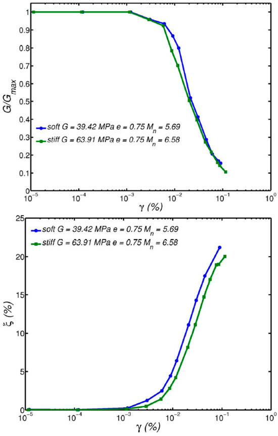 Variation of normalized shear modulus and the damping of two synthetic soil samples [31].