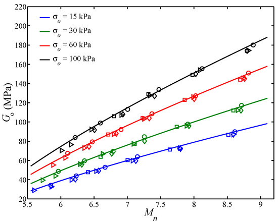 In discrete element analysis, it was found that the mechanical coordination number (i.e., the average number of contacts for particles that effectively participate in load transmission through the contact force chains), particle shape, and interparticle contact law were found to be the main factors that dictate the soil’s low-strain stiffness properties. For a specific level of confining stress, the shear modulus of a particular soil is shown to be linked to the mechanical coordination number by a unique relation, as shown in Figure 15. This finding provides a possible explanation for the lower shear wave velocity measured for the simulated hydraulic-filled soil sample. Two soils deposited by the hydraulic fill and dry pluviation methods yielded different soil fabrics and number of particle contacts, and they were expected to have a different shear modulus or shear wave velocity. As a result, engineering judgment must be exercised when predicting shear wave velocity by using the relationships proposed in [16,29], especially for loose soil with void ratios larger than 0.70.