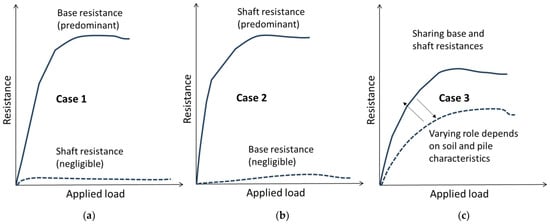 Contributions of base and shaft resistances to the total bearing capacity of piles in 3 different cases: (a) Case 1, where the base resistance is predominant; (b) Case 2, where the shaft resistance is predominant; and (c) Case 3, where both the base and shaft resistances are significant contributors to the total bearing capacity.