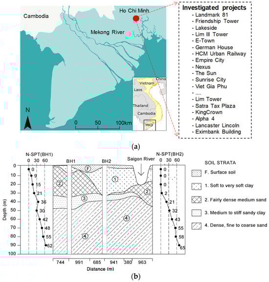 An extensive site investigation over the past 10 years of pile foundation practice in the Mekong Delta (South of Vietnam) was carried out to improve understanding of the base resistance of piles in soft soil [9]. The investigation went through 37 different high-rise building projects located on the very soft ground of Ho Chi Minh City, Vietnam (Figure 2a), resulting in a collection of 86 different long and large piles. These piles were selected for detailed assessment because they were all longer than 40 m (classified as long to very long piles) and subjected to static load tests where instrumentation enabled the shaft and base resistances to be estimated. They had an equivalent diameter ranging from 1.0 to 2.5 m and a length of up to nearly 100 m, and were installed on complex geological strata, including various soft soil layers. Figure 2b shows a typical profile of the ground near the Mekong River. The soft to very soft soil layer (SPT < 5), which would make a minor contribution to the pile bearing capacity, can reach up to 35 m in depth. On the other hand, Layer 4, i.e., 30–40 m thickness of dense fine to coarse sand, can be the largest contributor to the shaft (skin) resistance of piles. The SPT of soil only exceeded 50 at a depth > 70 m (dense sand), which is also the normal required depth for pile embedment, thus very large and long piles are often used for high-rise buildings in this region.
