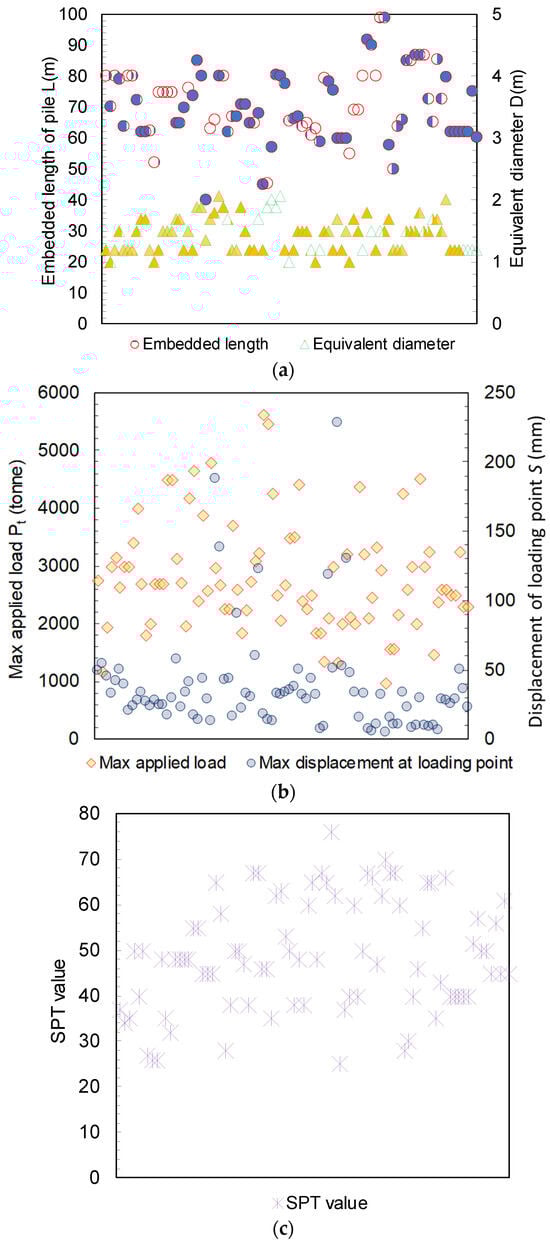 Distribution of the tested pile’s primary features: (a) the embedded length and equivalent diameter, (b) the maximum applied load and settlement, (c) the SPT value of soil beneath the pile toe.