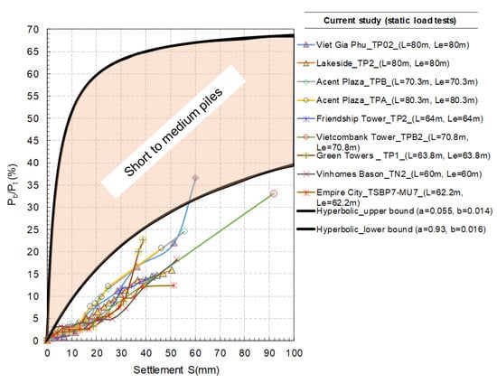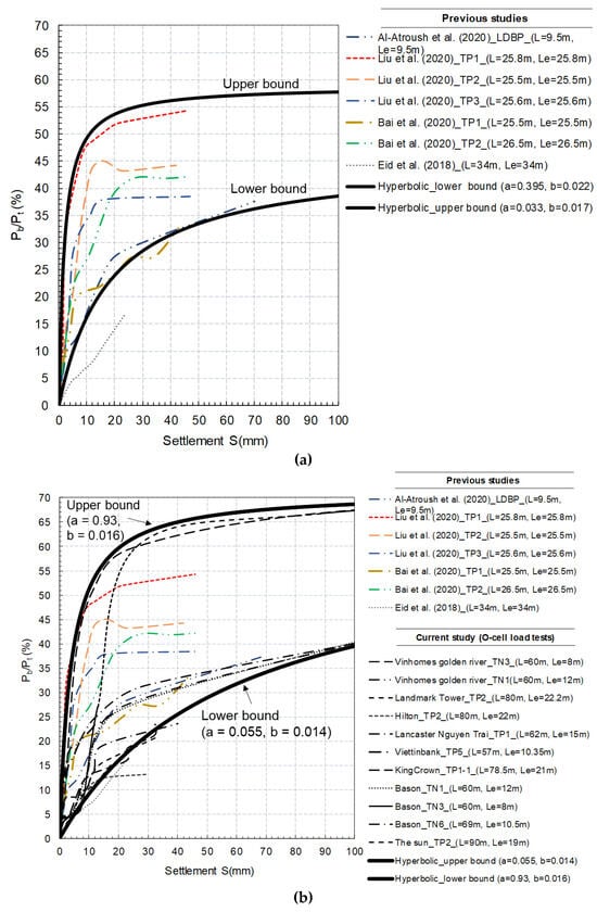where a and b are the constants changing with different soils. In this description, Pb rapidly develops at the initial stage and then becomes stable, despite the increasing settlement. Nonlinear behaviour begins to occur when the settlement S exceeds 5–10 mm. The lower and upper bounds for these data are defined with the values of a that change from 0.033 to 0.395, while b varies slightly from 0.017 to 0.022, respectively. On the other hand, Figure 4b shows the combination of data from the previous and the current site investigations. It is important to note that the current data for short piles were obtained from O-Cell tests where the loading points were placed 20 to 30 m away from the pile toe. The length from the loading point to the pile toe is termed as “effective length” (Le), which is different from the real (physical) length of the piles (57–90 m). For this extension of data, the value of a becomes wider, i.e., a = 0.055 to 0.93. This indicated that the distance from the loading point to the base, i.e., the effective length, plays a crucial role in the load transfer behaviour of piles.