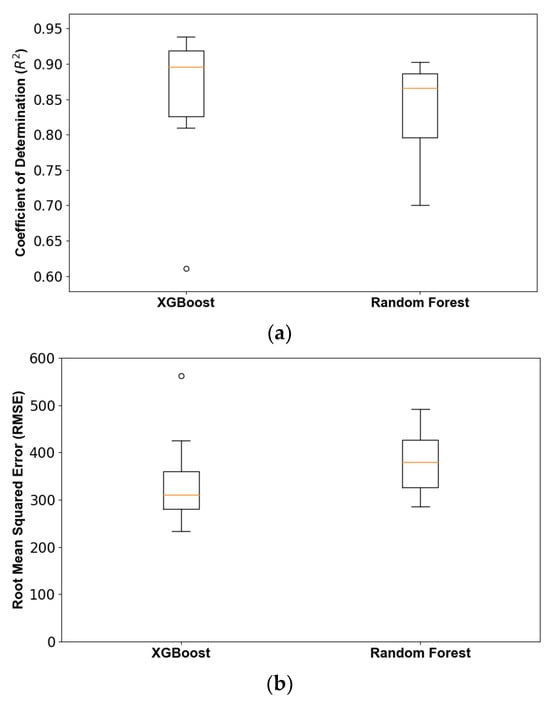 Performance of XGBoost and Random Forest (RF) models through 10-fold cross validation using 85% of the original dataset: (a) coefficient of determination; and (b) root-mean-squared error.
