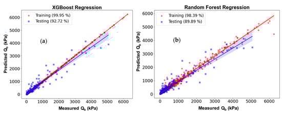 Figure 8 shows the performance of XGBoost and RF models through 10-fold cross-validation during the training phase. The results indicate the more reliable and accurate prediction given by XGBoost. For example, the mean R2 for XGBoost is nearly 90%, whereas it is about 86% for the RF model. Further, the RMSE induced by XGBoost is about 320, which is relatively lower than that made by RF. Figure 9 compares the measured and predicted data using the two built models based on the XGBoost (Figure 9a) and Random Forest (Figure 9b) algorithms. The results show highly accurate predictions by the two models, i.e., RF and XGBoost, when their R2 values are nearly 90% and 92.7%, respectively. The XGBoost algorithm yielded better performance, as it produced a larger R2 compared than its counterpart. In fact, XGBoost had almost perfect success in training, with R2 approaching 100%, followed by a high degree of R2 in the testing phase, indicating that no over-fitting that had occurred. The assessment proved the success in building machine learning models for predicting the base resistance of pile foundations, and thus the confident use of model outcomes for advancing our understanding of the influencing factors on base resistance. It is also important to note that using different subsets of data for training and validation resulted in variation in model performance (varying R2 and RMSE). This was because of the non-uniformity of data, causing varying features of data subsets, which can be minimized by using a larger and more complete database [24,38].