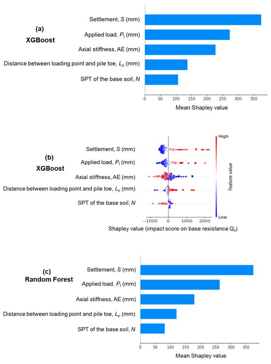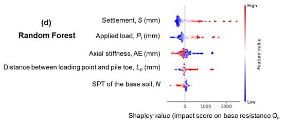 In this section, the earlier established machine learning models are used to advance our understanding of the influence that settlement can have on the behaviour of base resistance Qb of the pile foundation. Figure 10 presents the results from SHAP analysis for the impacts that different input features have on Qb. The results confirm the most impactful role of settlement on the base resistance, as this feature received the largest mean score, i.e., approximately 350, which is agreed by both XGBoost and RF models. This score is significantly larger than those induced by the second and third impactful features, i.e., the applied load Pt and axial stiffness AE. Interestingly, the stiffness of soil beneath the pile toe (SPT value), which is often believed to be one of the most important factors influencing the base resistance [7,39], received the lowest score (around 100 and 75 by XGBoost and RF, respectively). This was because all the collected long piles in this investigation sat on relatively the same soil condition, i.e., the N value mostly varied in a narrow range from 40 to 70 (dense to very dense sandy soil), as shown in Figure 3. The positive and negative scores from the SHAP analysis (Figure 10b,d) represent how the features influence the predicted outcome. The predominant range of high positive scores (red at the right-hand side) by settlement indicates that this factor has mainly a positive impact, i.e., a progressive relationship, on the base resistance. On the other hand, the scores for axial stiffness are distributed at both negative and positive sides of the charts, meaning that increasing axial stiffness does not always lead to larger base resistance of piles.