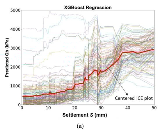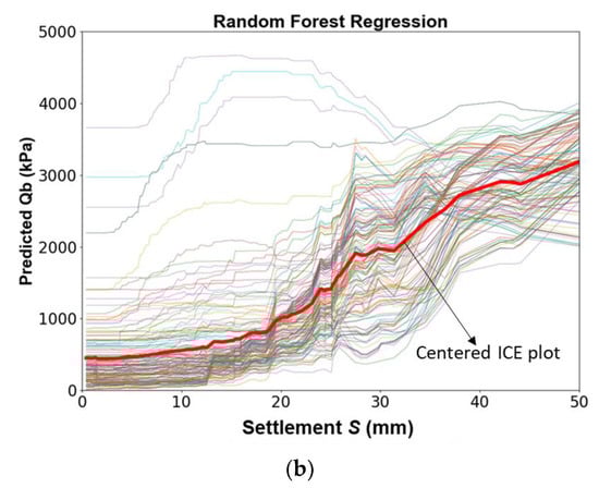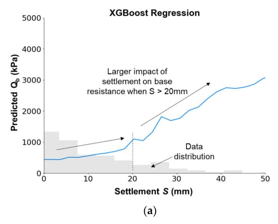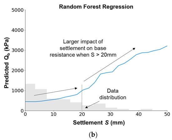 The relationship between the settlement and base resistance can be quantified using the partial dependence plot based on the trained machine learning models, as shown in Figure 11. In this analysis, the settlement was varied in a given range, e.g., 0 to 50 mm, and combined with other inputs to form various datasets based on Monte-Carlo theory. The average predicted Qb corresponding to each value of settlement S can then be used to create the partial dependence plot, i.e., [36]