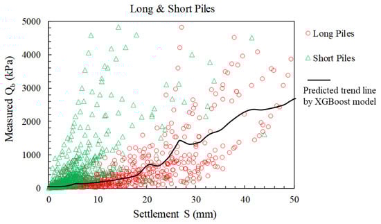 Figure 14 represents how well the predicted trend line by the XGBoost model matches the actual behaviour of base resistance in long piles. The data not only show the distinctive response of long piles to increasing settlement in comparison with short piles, as explained earlier, but also proves the excellent capability of the trained model, with its main focus on long piles.