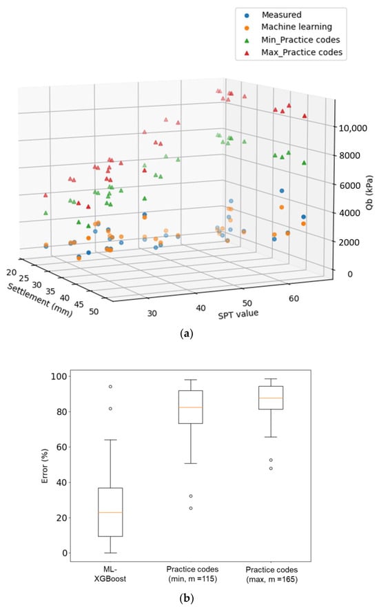 Comparison of machine learning-based predictions incorporating the influence of settlement, and conventional practice methods: (a) 3D distribution of Qb in relation to S and SPT; and (b) percentage error of prediction.