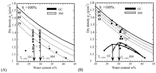 Position of the initial states of tested GC and BM samples. (A) Unsaturated samples after dynamic compaction “the initial moisture is constant for each sample series”. (B) Initially saturated and unsaturated samples after static compaction.