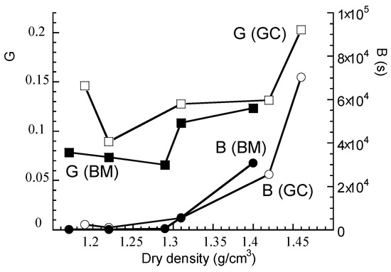 The relationship between G and ρd in Figure 3 shows a decreasing trend as ρd decreases (except for the two lowest densities where an increase in G appears for both BM and GC). The exact behavior remains difficult to estimate given the limited number of swelling tests considered, and the increase in G at low densities needs to be confirmed. Globally, swelling tests confirm the idea that the denser the soil, the higher the B and G values [36]. This means that the low densities favor the rapid filling of macropores, which implies a low value of B, a faster stabilization of the swelling deformation in the long term (related to the time needed to reach a plateau) and a lower amplitude of swelling compared to the denser soils (which is reflected by the decrease in G). These results reflect an amplification of swelling with increasing dry density, which is consistent with other studies [21,37,38].