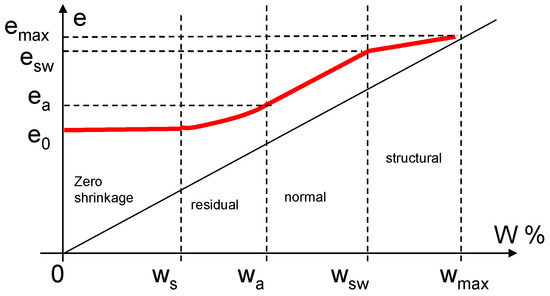 Typical shrinkage curve on a macroporous soil (The shrinkage curve is in red color while the dashed line identifies the remarkable points on the curve) [39,40].