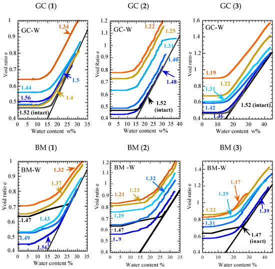 Results in Figure 5 also show that the shrinkage limit ws (as defined in the NF P 94-060-2 [41]) does not change when the density of GC or MB W-disturbed samples varies. In fact, the ws (corresponding to the water content at the intersection of the two linear parts of the shrinkage curve) measured on W-BM or W-GC remains equal to 17%, which corresponds to the ws of intact GC soil, but is different from the ws measured on intact BM (ws = 23%). The ‘physical’ shrinkage limit also remains constant around 6–7% when BM-W or intact BM soil are tested; meanwhile, the wS measured on GC-W or intact GC is close to 13%. The high deformability of clayey soil (that may reorganize easily and rapidly when the water content varies) compared with the high structuring of marl, given by the carbonate particles, may explain the difference in behavior between clay and marl. Considering the air entry point (with or without remodeling), the characteristic of intact or W-disturbed GC soils does not change when density varies, while for BM, it varies after remolding from 26.6% to 20% whatever the density varies.