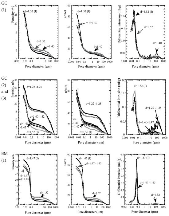 Pore size distribution (PSD) of intact (I) and W-disturbed BM and GC at different densities (static compaction) at the end of a direct shrinkage test after drying at 105 °C. (1) Initially saturated samples (initial moisture content varies), (2) initially unsaturated samples (samples are prepared at similar initial moisture), and (3) after a free-swelling test on initially unsaturated samples. The color or grey levels make easier the curves distinction.