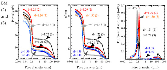 Such behavior agrees with a two-dimensional porosity description with micro- and macropores, as proposed by [33]. The PSD measurements in Figure 6 confirm that disturbed soils are characterized by a bi-modal porosity [45] with a larger proportion of macropores >1 µm at low density. The pores with a pore diameter over 100 µm are assimilated to ultra-macropores (spaces between blocks of soil (composed by aggregates of particles) and formed during the initial grinding of dried soil). The size of the micropore family < 1 µm (within aggregates) in GC-W does not seem to be affected by compaction contrary to BM-W (2) and (3), as stared before. The average size of the micropores in disturbed BM samples prepared in the initial unsaturated state varies in density from 0.05 µm to 0.1 µm. In terms of pore quantity, the macropore fraction for GC and BM (ranging from 10 µm to 100 µm) increases with decreasing density. In both cases, the micropores < 0.1 µm seem to be more abundant in intact soils than in disturbed ones at the end of the shrinkage. The nanopores represented by the <5 nm pore fraction in the n/ntot graph in Figure 6 seem to decrease with soil disturbance, especially for GC (1) and BM (1). The nanopore fraction represents the percentage that reaches 100% on the n/ntot curves (the total porosity ntot is estimated from the void ratio e, calculated from the displacement and weight measurement during the shrinkage test). However, the n/ntot curves can be distorted because, at low densities, the ultra-macroporosity (not measured by mercury intrusion but taken into account in the void ratio measurement) can contribute to the apparent decrease in nanopore fraction. Therefore, the nanopore variation needs to be confirmed, as micro- or nanopores were previously considered to be unaffected by compaction.
