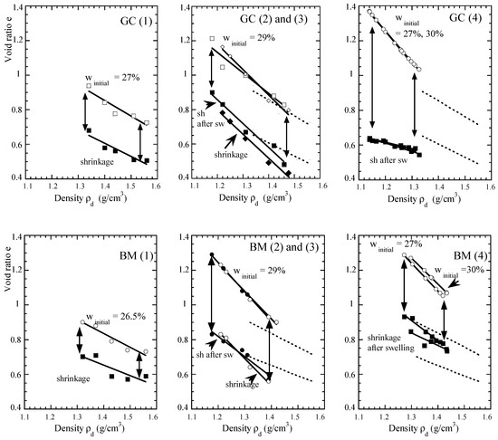 On the Figure 5, the initial void ratio for each curve, and the final void ratio corresponding to zero water content were positioned. Pairs of points were plotted in Figure 7, versus the dry density of each tested sample. The slopes of the linear fit are given in Table 2. The slope corresponding to the shrunken state is lower than the slope of the line supporting the points at initial water content, except for BM (2) or GC (2).
