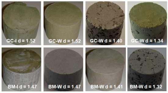 Photos of W-disturbed compacted samples compared with an (I) intact sample of green clay (GC) and blue marl (BM).