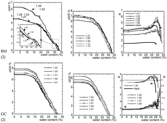 The ratio R for W-BM (2) also indicates that the anisotropic shrinkage of intact marl is modified after disturbance. The anisotropy results from not only sedimentation by the deposition of oriented clay layers combined with carbonate particles (the orientation disappears during disturbance), but also from compaction. At high density, the ratio R tends to be 3 at zero water content, indicating isotropic behavior, while at low density, R reaches 4, considering the measurement of low ∆H/H0 values (in relation with, hypothetically, the cracks opening). In the case of the denser soil, no cracks seem to develop. Furthermore, the compaction effect on the soil produces an orientation of the microstructural units, favoring an increase in ∆H/H0, which balances the density effect, that is to say, the decrease in pore size in favor of a smaller amplitude of shrinkage. In other terms, the static compaction of the soil at high densities induces a large orientation of particles or aggregates parallel to each other in the soil, which becomes a “continuous” matrix without ultra-macroporosity. By increasing the degree of orientation, the amplitude of shrinkage is increased, even if the global void ratio decreases. Such an explanation can be used to understand why ∆H/H0 or ∆D/D0 (Figure 9), measured on W-GC (2) at high densities, seems to indicate that the high densities are in favor of high shrinkage amplitude. The ratio R (around 3) indicates that the shrinkage strain of intact or disturbed green clay remains isotropic as the water content tends to zero. At the beginning of drying, the shrinkage is not isotropic for either GC or BM. Globally, after a few points, ∆V/V0 for W-BM (2) or dense W-GC-disturbed soil or GC-intact soil becomes higher than 3∆H/H0, which means that the deformation occurs essentially in the direction of compaction (artificial compaction in the laboratory or a natural one during diagenesis on site).