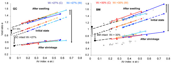 W-disturbed BM and GC soils noted (4) in Table 2 were prepared by dynamic compaction at different initial densities. Each set of densities was obtained for two initial water contents. A free-swelling test was carried out in an oedometric cell followed by a free volumetric shrinkage test (the sample weight and dimensions were manually reported at the beginning and at the end of the test). The results shown in Figure 10 relate the air index noted eair,i (i for initial state) and the total void ratio e (Equation (4)) [47]. The air index is the ratio of the volume of air in the sample (Va) to the volume of solid particles (Vs)