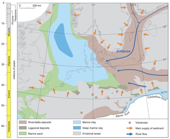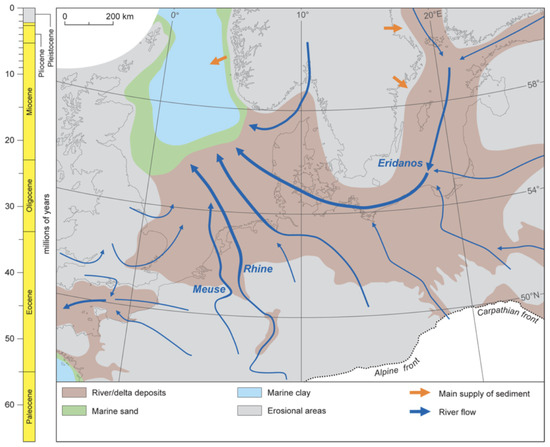 - Gibbard, P.L.; Lewin, J. Filling the North Sea Basin: Cenozoic sediment sources and river styles (André Dumont medallist lecture 2014). Geol. Belg. 2016, 19. [Google Scholar] [CrossRef]