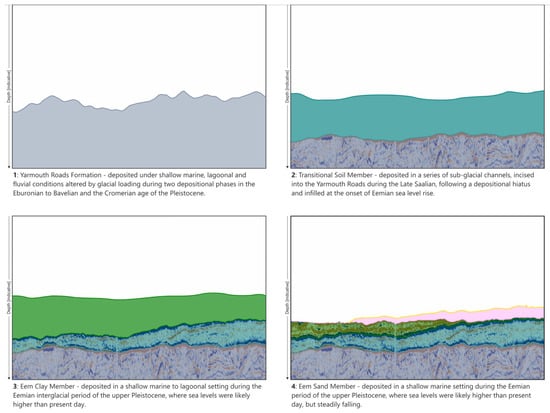 The complexity of the Middle to Late Pleistocene geological record can be demonstrated using the depositional history model for the Ijmuiden Ver Offshore wind farm zone on the Dutch Continental Shelf [25]. The conceptual model (Figure 4) starts from the deposition of the Yarmouth Roads Formation during the Mid-Pleistocene. Towards the end of the penultimate (Saalian) glaciation, sub-glacial channels incised the Yarmouth Roads Formation and were subsequently infilled during the sea level rise marking the onset of the following interglacial (Eemian) period.