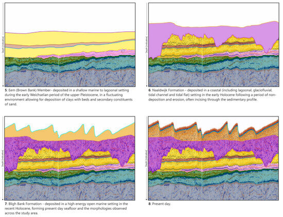 During the Eemian, clays were first deposited in a period with high sea level (Figure 5). As sea level was gradually falling, sands were deposited and finally, in a shallow marine to lagoonal setting, an alternation of sand and clay was deposited (Brown Bank Member). During the last (Weichselian) glaciation, channels were eroded again, this time in the underlying Eemian deposits. These channels were infilled during the early Holocene transgression in a coastal environment. Finally, continued sea level rise throughout the Holocene gave rise to a high-energy open marine environment where sand was deposited, with the formation of bedforms (sandwaves and megaripples) which can clearly be noticed on the present-day sea floor from bathymetric surveys.