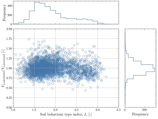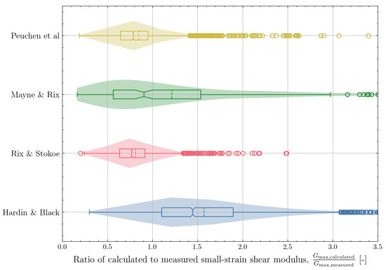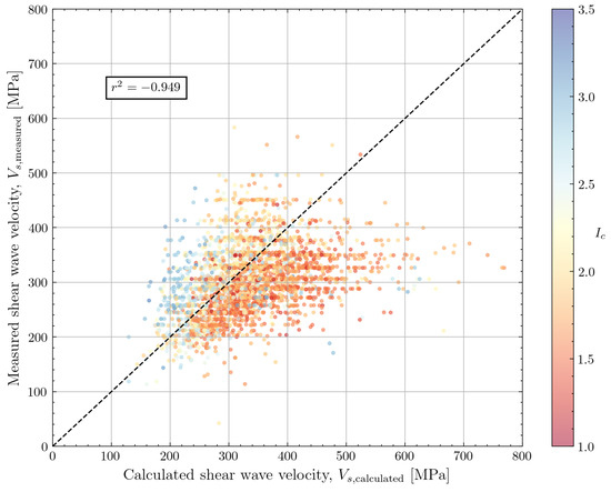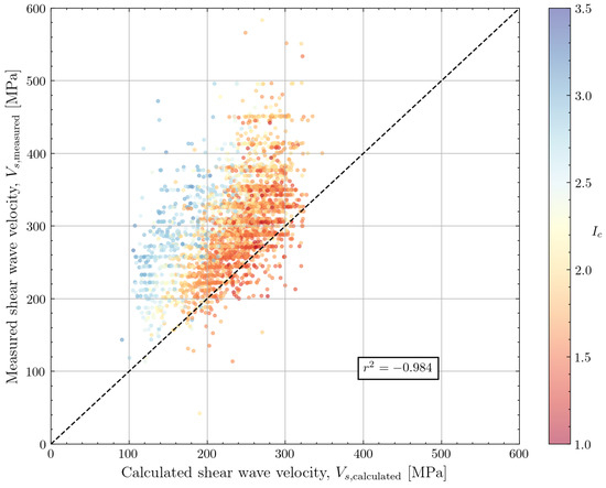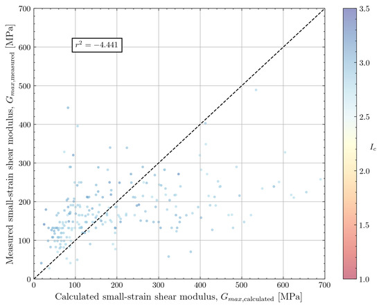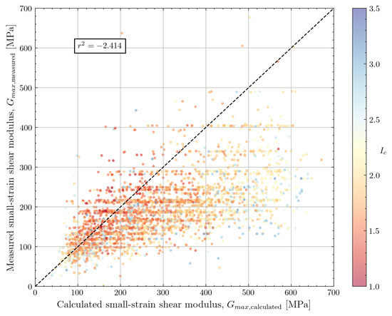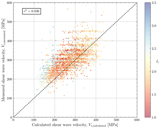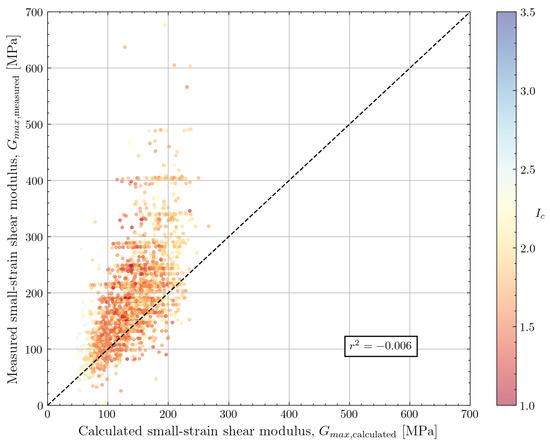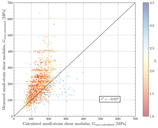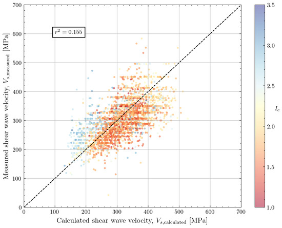 In this section, the CPT-based correlations for and which are most widely used by geotechnical designers are reviewed. The selected correlations are shown in Table 2. The underlying datasets used for calibrating the semi-empirical correlations and the physical meaning of their mathematical formulae are discussed and the predictions for the North Sea dataset are evaluated through scatterplots of calculated vs. measured or . These scatterplots are presented for each of the evaluated correlations. The measured values of or the values of inferred from the measured shear wave velocity using the density measured at the depth of the geophones are plotted against the estimated value of or . The measurements are colour coded based on the soil behaviour type index [16] to allow a visual distinction between the behaviour for the different soil types. The dashed black lines in the figure represent parity, where or are perfectly estimated.