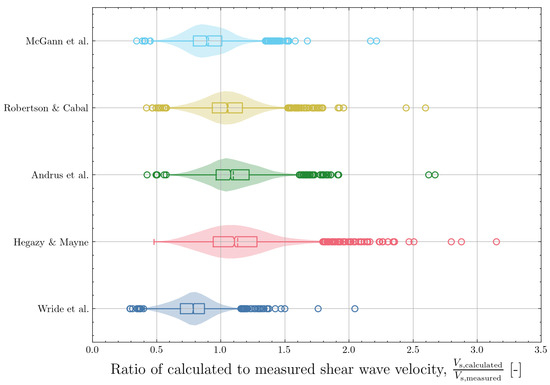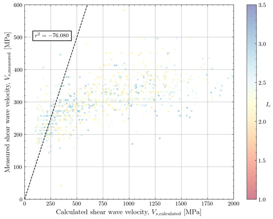 The performance of this correlation against the North Sea dataset is visualised in Figure 11. The formula proposed by Rix and Stokoe [9] leads to an underestimation of , especially for data at deeper depths and consequently a higher shear modulus. The coefficients in Equation (4) can be re-calibrated based on Bayesian updating with the North Sea data [37]. The re-calibration resulted in an increase in the multiplier in Equation (4) from 1634 to 2241. Although not shown in the figure, the results from the re-calibrated formula show a better fit for up to 300 MPa. However, for measurements with 300 MPa, an underestimation was still noticed.