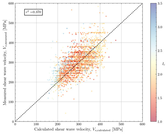 Comparison of calculated and measured using the correlation by Rix and Stokoe [9]. The measurements are colour coded according to soil behaviour type index .