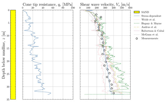 When applied to two example locations from a southern North Sea site, the potential variations in estimates when using different correlations become apparent. The correlation by Hegazy and Mayne [12] leads to systematic overestimation of and the correlation by Wride et al. [11] to systematic underestimation of . The correlation by Robertson and Cabal [16] shows an acceptable performance, although an overprediction of in deeper sand layers is noticed. The newly developed stress-dependent model shows the most accurate predictions at the example locations which is partly explained because this model was specifically calibrated to North Sea data. The results from all correlations should be treated with caution for shallow soils. The reliability of models in the top 5 m of the soil still needs to be investigated further. The S-PCPT in this depth range was deemed unreliable and alternative means of characterisation such as Multichannel Analysis of Surface Waves (MASW) needs to be considered. However, such measurements are rarely performed offshore.
