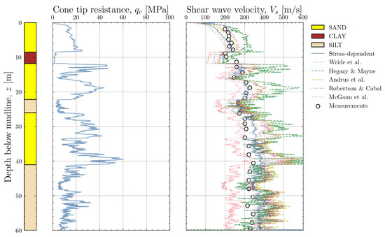 To perform location-specific soil–structure interaction analysis (e.g., natural frequency analysis), soil stiffness profiles need to be developed at every foundation location. When direct shear wave velocity measurements at the location under consideration are not available, a correlation between conventional CPT measurements and shear wave velocity (or small-strain stiffness) is generally used. Several authors have formulated correlations between CPT measurements and or [8,9,10,11,12,13,14,15,16,17,18], each based on a dataset containing both CPT measurements and direct measurement of . It should be noted that and are related through the fundamental relation , where is the bulk density of the soil. Each of the correlations from the literature is based on a unique dataset which contains specific soil types and applies to the geological setting at the sites used for calibration. Using such correlations introduces a model uncertainty or transformation uncertainty [19] in the geotechnical analysis as the small-strain shear modulus profile is derived indirectly. It should be recognised that the CPT leads to large strains in the soil, whereas or apply to small-strain conditions, and, as such, finding a good correlation between CPT data and or is challenging.