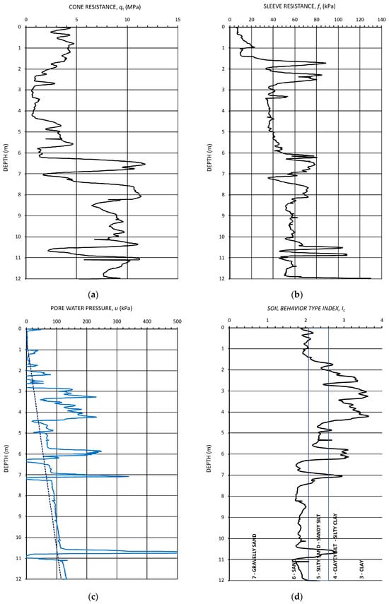 Results of CPTU: (a) cone resistance, (b) sleeve resistance, (c) hydrostatic and pore water pressure, and (d) soil behavior index.