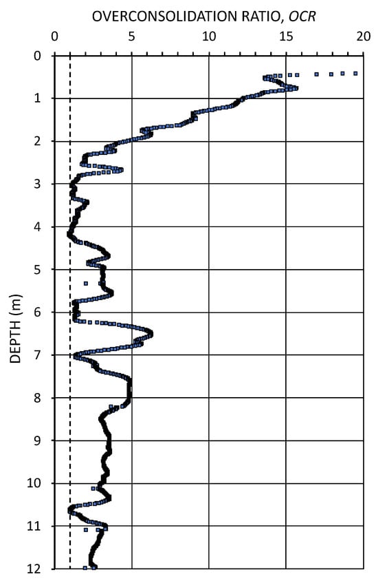 Based on the information derived from the CPTU, the OCR was calculated using Equations (3) and (4). The following values of the grain size parameter were assumed: sand m′ = 0.72; silt m′ = 0.8. The estimated OCR as a function of depth is shown in Figure 3. Due to its definition, OCR can be very sensitive (too high) at shallow depths due to the low vertical effective stress. The soil layer down to about 1.5 m is heavily preloaded with OCR ranging from 8 to 15. Below that depth, OCR varies typically between 1 and 5, with an average value of 2.5. For practical purposes, the sand deposit below 2 m depth can be classified as slightly overconsolidated, except for two layers between 3 and 4.5, 5.5 and 6.5, and 7.5 and 8 m.
