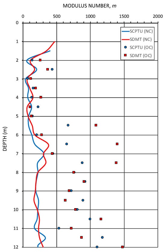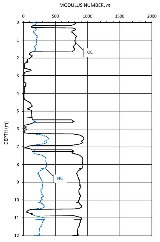 Modulus number derived from CPTU for assuming normally consolidated (NC). The effect of preloading (OC) was considered according to Equation (5).