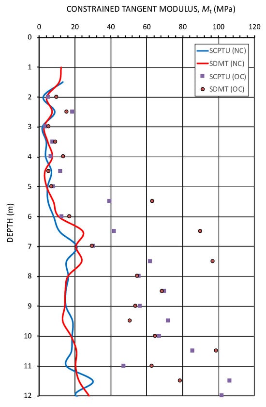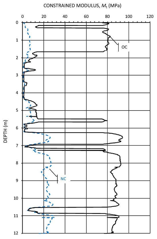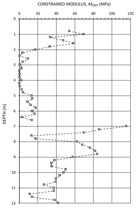 The geotechnical literature describes different empirical methods for estimating the constrained modulus from DMT [,]. These references suggest that the constrained modulus, determined from DMT (MDMT), is equivalent to the vertically drained confined (one-dimensional) tangent modulus as obtained by an oedometer.