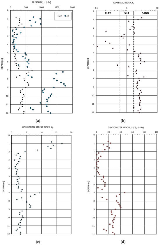 Results of DMT: (a) pressure readings, (b) material index, (c) horizontal stress index, and (d) dilatometer modulus.