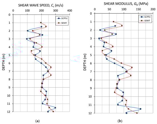(a) Shear wave speed as determined from seismic down-hole tests (SCPT and SDMT) and (b) Small-strain shear modulus, G0, from SCPT and SDMT.