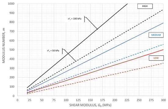 where ν = Poisson’s ratio, γ = shear strain, σr = reference stress (100 kPa), and σ′v = vertical effective stress. A shear strain level (γ) of 0.25% was used, which can be considered to represent static loading conditions. The interpretation of Equation (10) is shown in a diagram presented in Figure 10. The diagram shows a relationship between the small-strain shear modulus and the modulus number for two levels of vertical effective stress level. Three different types of sandy soil (low, medium, and high) are identified.