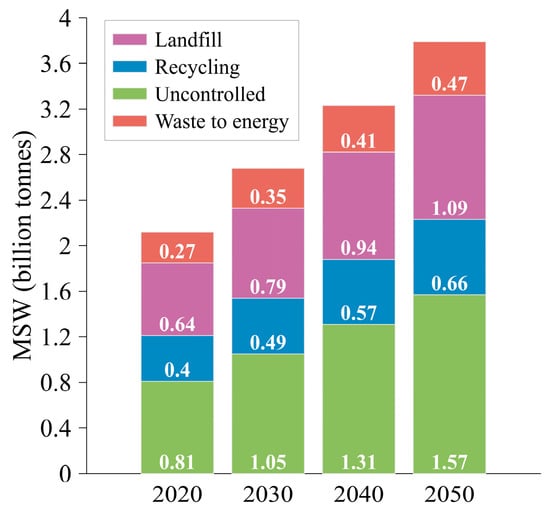 Projections of global municipal solid waste generation in 2030, 2040, and 2050 [2].