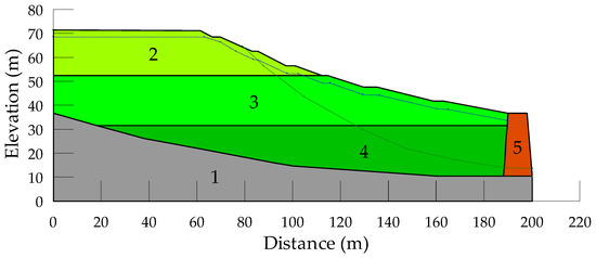 The stability analyses in this study consider actual slip surfaces, failure mechanisms, material characteristics, and leachate conditions. These data were obtained from previous studies, where authors determined these factors through back analyses and field observations. In two of the cases analyzed—Maoershan and Xiaping—dams were constructed at the edges of landfills to stabilize the slopes. In the Maoershan landfill, the slip surface intersected both the waste body and a stone slurry dam, leading to the failure of both structures during the event. In contrast, in the Xiaping case, the slip surface was located behind the dam, which remained unaffected by the failure event. The geometry, geotechnical conditions, and relevant properties of waste and foundation soils of the MSW landfills are presented in Figure 2, Figure 3, Figure 4, Figure 5 and Figure 6 and Table 2, Table 3, Table 4, Table 5 and Table 6. Descriptions of the MSW and soil layers shown in Figure 2, Figure 3, Figure 4, Figure 5 and Figure 6 are provided in the corresponding Table 2, Table 3, Table 4, Table 5 and Table 6. The calculated factors of safety of analyzed slopes are around unity, which is consistent with the results presented in the reviewed literature [10,17,18,19,20].