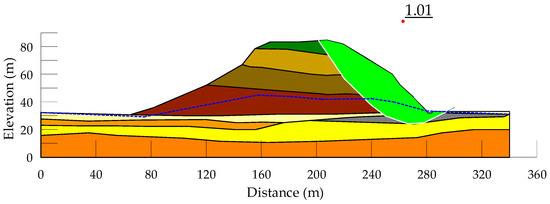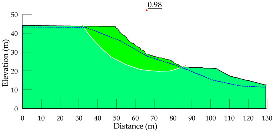 The results of the stability analyses for static loading are presented in Figure 7, Figure 8, Figure 9, Figure 10, Figure 11 and Figure 12. The Xerolakka MSW landfill exhibits the lowest factor of safety (FS = 0.98), while the highest factor of safety is observed at the Maoershan MSW landfill (FS = 1.08). The higher factor of safety at the Maoershan MSW landfill can be attributed to the retaining structure located at the edge of the slope, which significantly enhances stability due to its shear strength and the gradual slope angle (14°, 1:4.05). Conversely, the lower factor of safety at the Xerolakka MSW landfill is primarily due to the very steep slope angle (31°, 1:1.67) and the very high leachate level, which increases pore pressures, thereby reducing shear strength on the slip surface due to decreased effective stress. The factors of safety for the other analyzed slopes range from 1.01 to 1.03, which are consistent with the observed slope failures in all the analyzed sites. The results of the slope stability analyses in all cases are in good agreement with the results from previous studies [10,15,17,18,19,20].