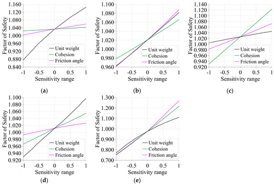 To determine the effects of each input parameter on the variation of the factor of safety for MSW landfill slopes, sensitivity analyses were conducted. In these analyses, the value of each parameter was varied between predefined minimum and maximum values, while the other parameters were kept at their mean values. The parameters varied in this study were unit weight, cohesion, and friction angle of MSW. The minimum values were determined by subtracting the standard deviation from the mean, while the maximum values were obtained by adding the standard deviation to the mean value of each parameter (Equation (5)).