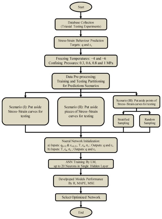 This research investigates the application of machine learning for enhancing the precision and applicability of artificial neural networks (ANNs) to mimic the stress–strain behavior of frozen sandy soils resulting from the experimental triaxial test. It aims to establish reliable and user-friendly models with an explainable and closed-form formulation for determining the stress–strain response of frozen sandy soil under different freezing temperatures and confining pressures. Thus, four different combinations of training and testing datasets, which are the outcomes of frozen samples under triaxial testing, and two different input feature combinations were also considered. To mitigate potential overfitting issues, a rigorous approach to model selection and evaluation was implemented. Model performance was assessed through comparisons with experimental data and unseen test data, and common error criteria were thoroughly evaluated and analyzed. Therefore, it was determined that if the developed models achieved an acceptable level of accuracy, they could be reliably used to provide a general estimation of the stress–strain behavior of frozen sandy soil, which is a key factor in general engineering design work. The aim is to overcome the lack of straightforward solutions for the mechanical behavior characterization of frozen sandy soils. The overall workflow is depicted in Figure 1.